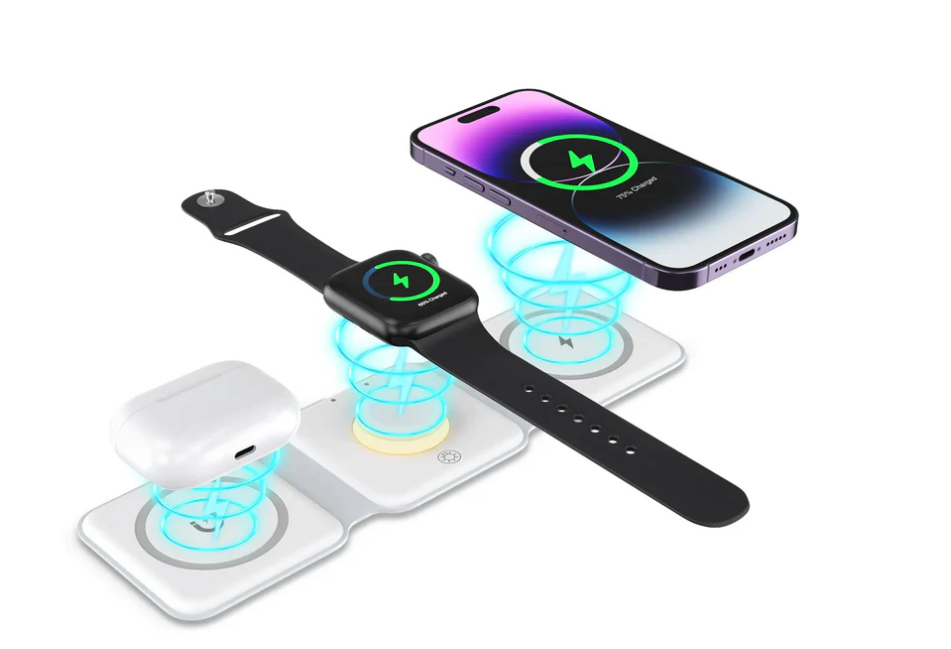 Presentamos el cargador inalámbrico, magnético y plegable. Carga tu móvil, reloj inteligente y auriculares de forma simultánea y silenciosa.