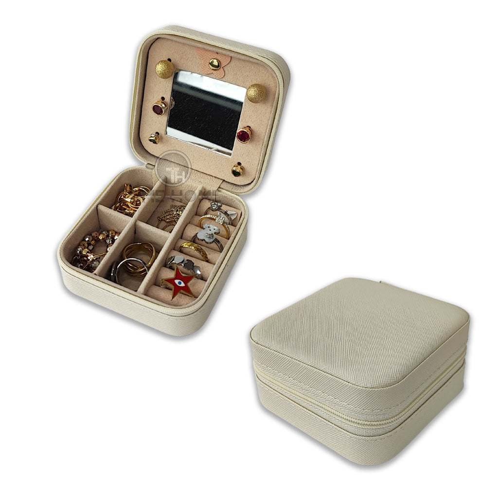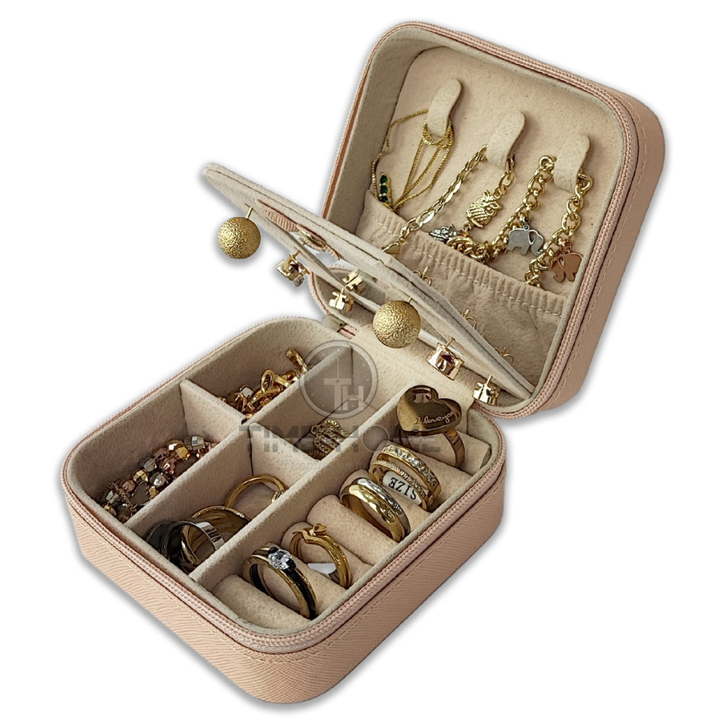 Categoría del producto: Joyero Función: Organizar Colores: Rosado Y Beige Material: cuero sintético - franela Tamaño: 10x10x5cm
